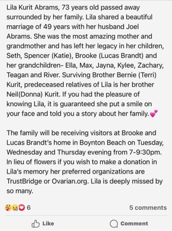 How devastating, Lila was my prom date, we were very close back then, my condolences to her family, she will be missedMarilyn Kellner